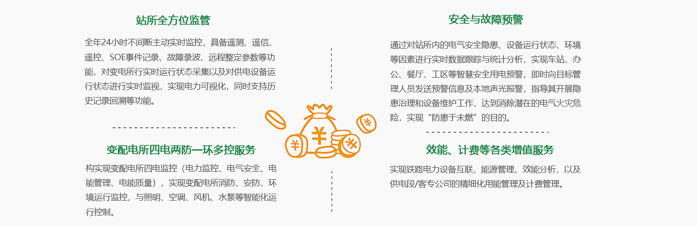 鐵路電力運維管理系統(tǒng)采用電力監(jiān)控、電氣安全、電能質量、用能管理、視頻監(jiān)控、輔助監(jiān)控、資產管理等一體化功能設計,實現(xiàn)對鐵路變配電所的全方位監(jiān)管,具備遙測、遙信、遙控、SOE事件記錄、故障錄波、遠程整定參數(shù)等功能,對電力運行狀態(tài)實時采集及監(jiān)視,全數(shù)據(jù)分析判斷,預案處理;集成運行維護管理、資產管理、環(huán)境監(jiān)控、門禁監(jiān)控、煙感監(jiān)控、視頻監(jiān)控等功能;用戶可通過后臺系統(tǒng)實時掌握變配電所整體運行狀況、獲取各類預警、報警事件,滿足電力無人或少人值守的需求,為用戶提供有效的專業(yè)技術保障及運維支撐,提高系統(tǒng)安全運行水平。