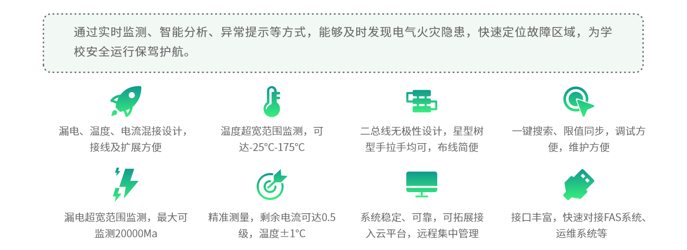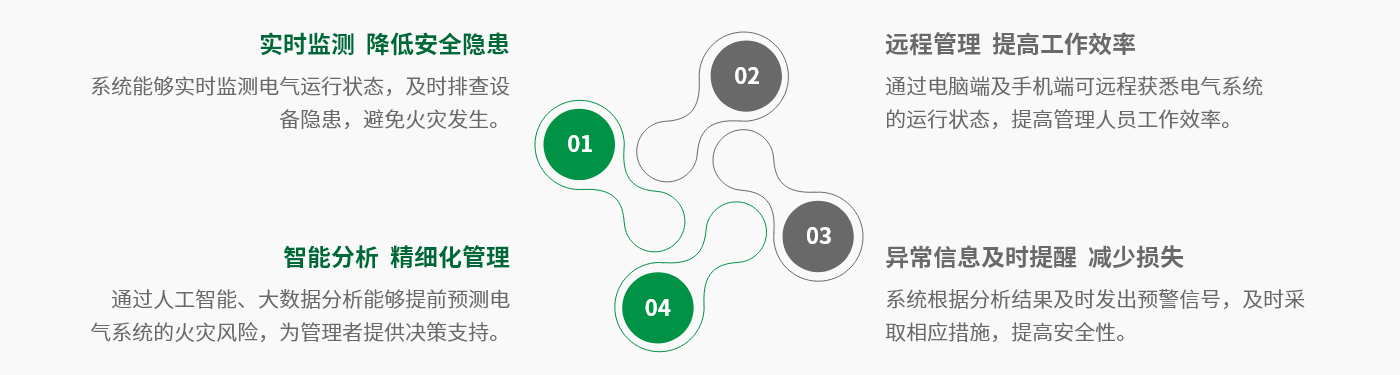 基于云計算、物聯網、大數據、AI、自取電、超級功耗等新一代信息技術,對電氣線路和用電設備進行不間斷的測量,輔助監測電氣設備溫度,實時發現電氣線路和用電設備存在的異常啟停、安全隱患等現象,并對引發電氣火災隱患進行預警、分析,一旦發現異常,可即時向安全管理人員發送預警信息,指導其開展隱患治理,達到消除潛在的消防安全危險,實現“防患于未然”的目的。
